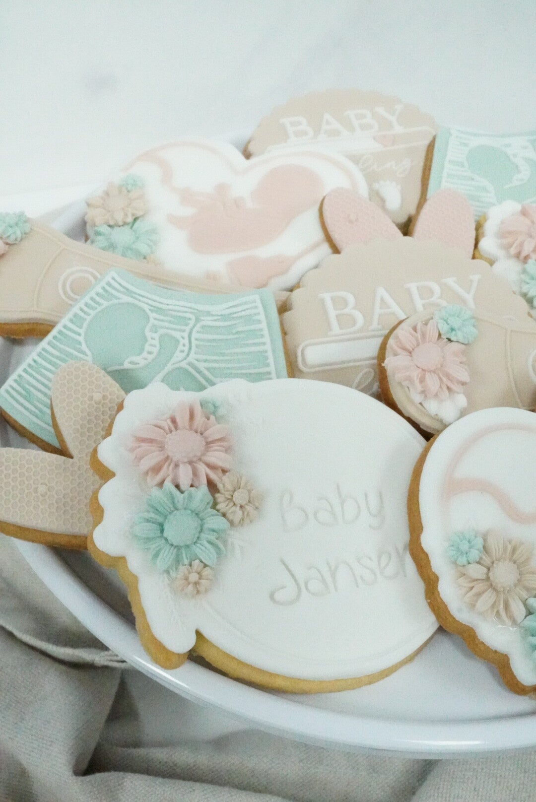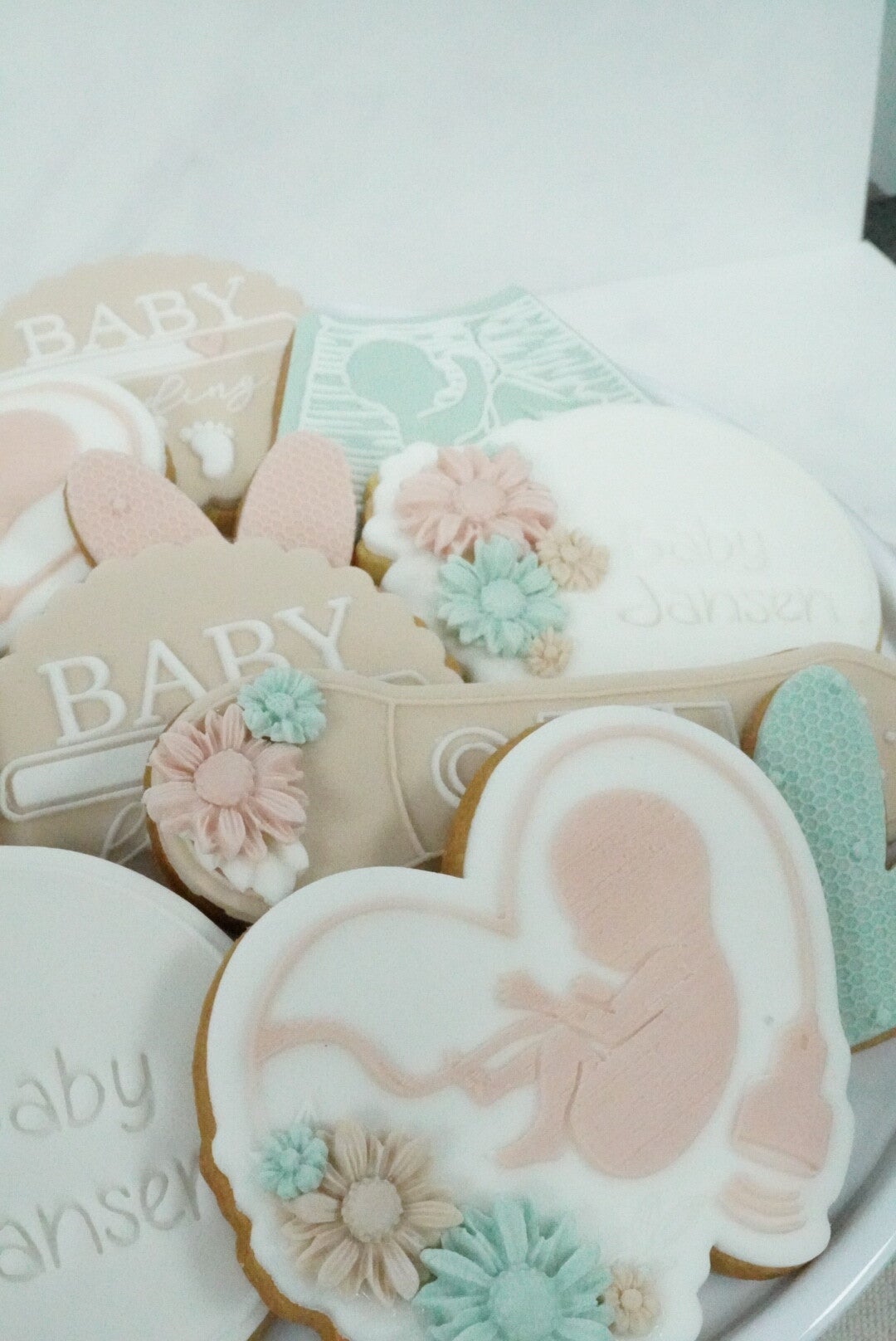 Maak de koekjes extra persoonlijk door een achternaam op de koekjes te laten verwerken, zoals in het voorbeeld: Baby de Jong.
