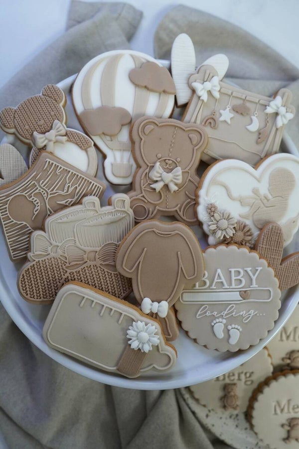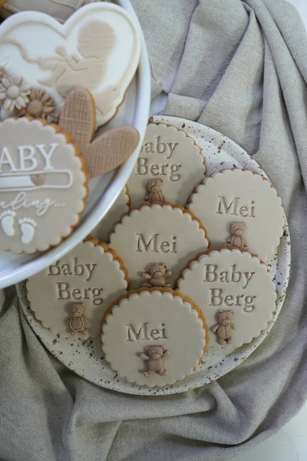 De set kan volledig naar wens in de gewenste kleurtinten worden gemaakt. Daarnaast kunnen we, indien gewenst, ook de achternaam en/of de toekomstige geboortemaand op de koekjes vermelden. Een unieke en persoonlijke manier om jullie mooie nieuws wereldkundig te maken!