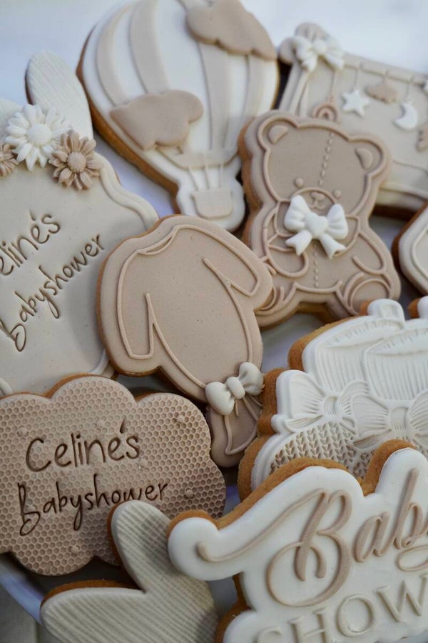 Deze Duo Set Babyshower is een heerlijke aanvulling op jouw babyshower of een leuk cadeau voor degene voor wie je het organiseert. De set bevat zowel Deluxe als Classic koekjes, die we kunnen personalizeren met de naam van de toekomstige mama. De koekjes zijn gedecoreerd in warme, natuurlijke tinten zoals ivoor, beige en bruin, voor een stijlvolle en feestelijke uitstraling. Toch liever een andere kleur? Geef het aan ons door en wij maken er iets moois van!