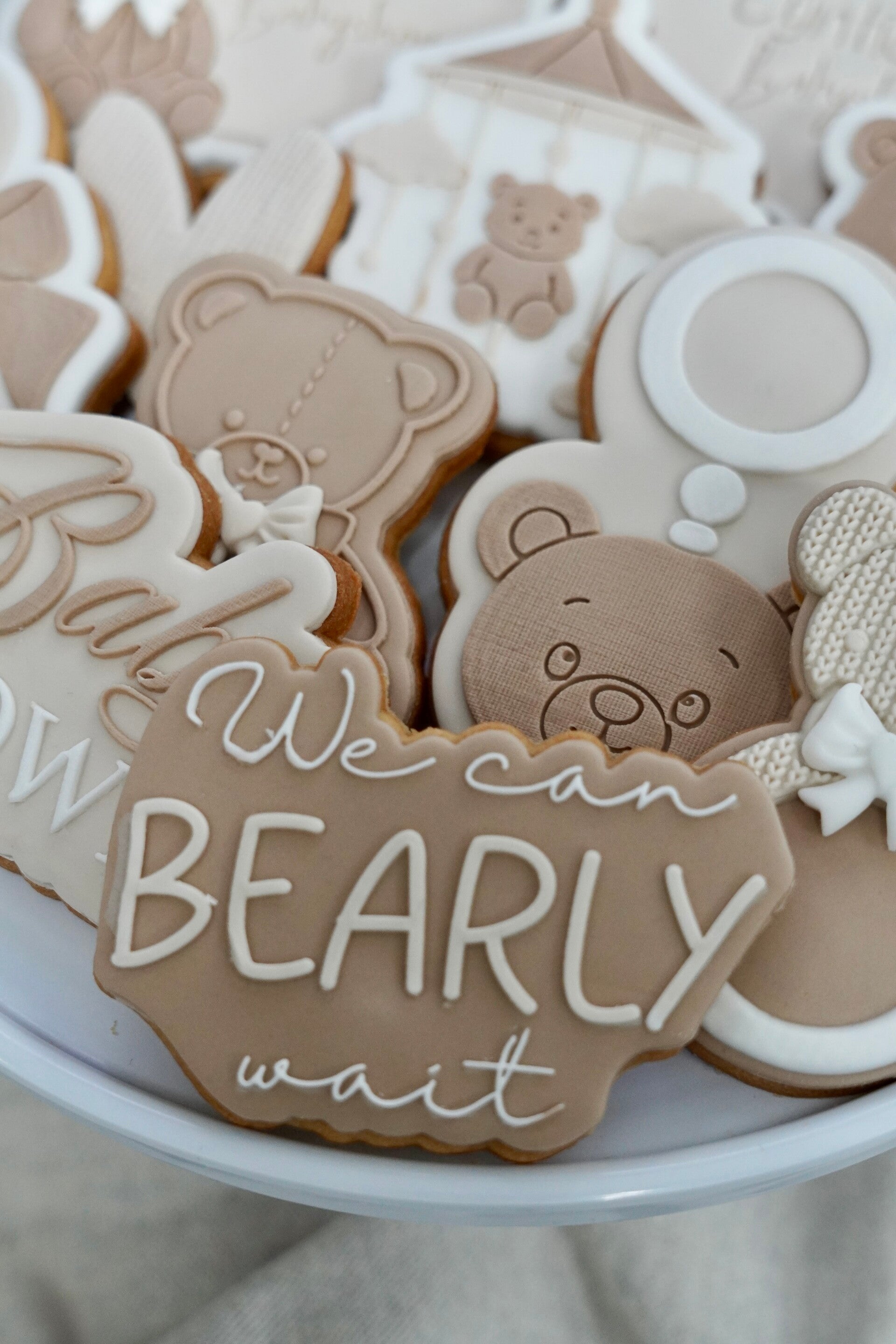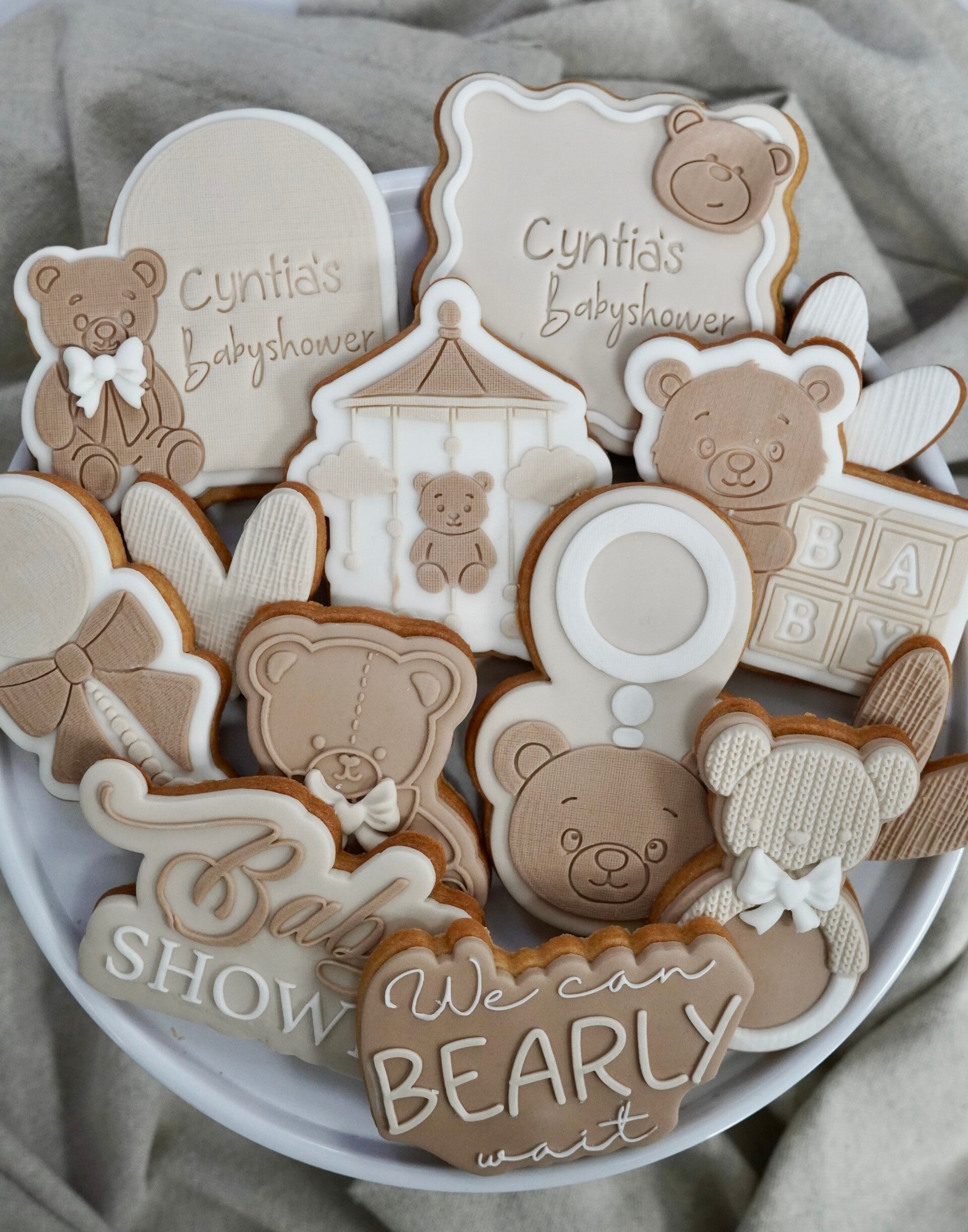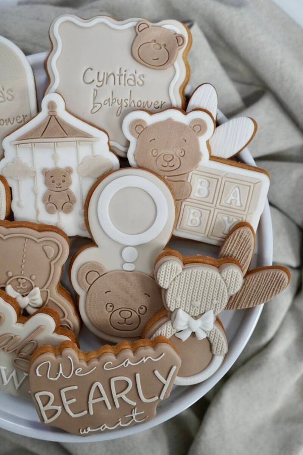 Vier je een babyshower in het thema 'We can bearly wait'? Dan is deze prachtige set een perfecte keuze. De set is uitgevoerd in zachte tinten bruin, beige en wit en is rijkelijk versierd met schattige beertjes.
