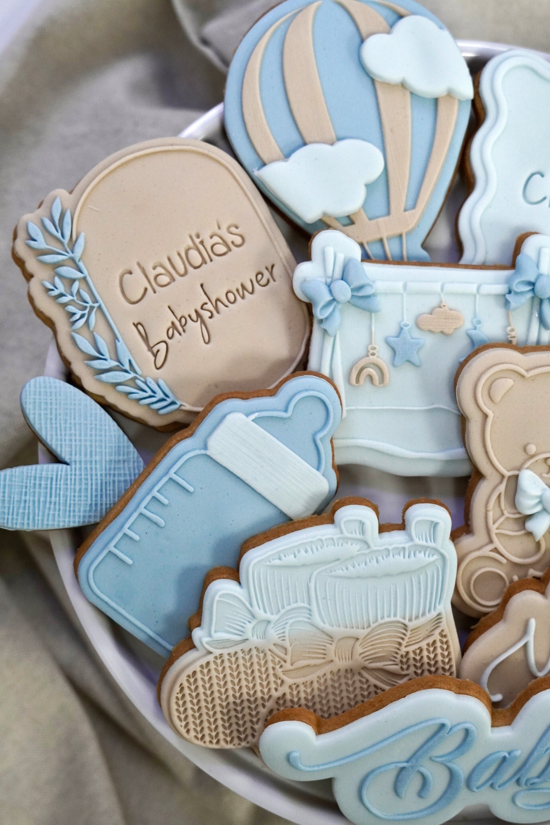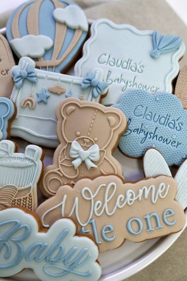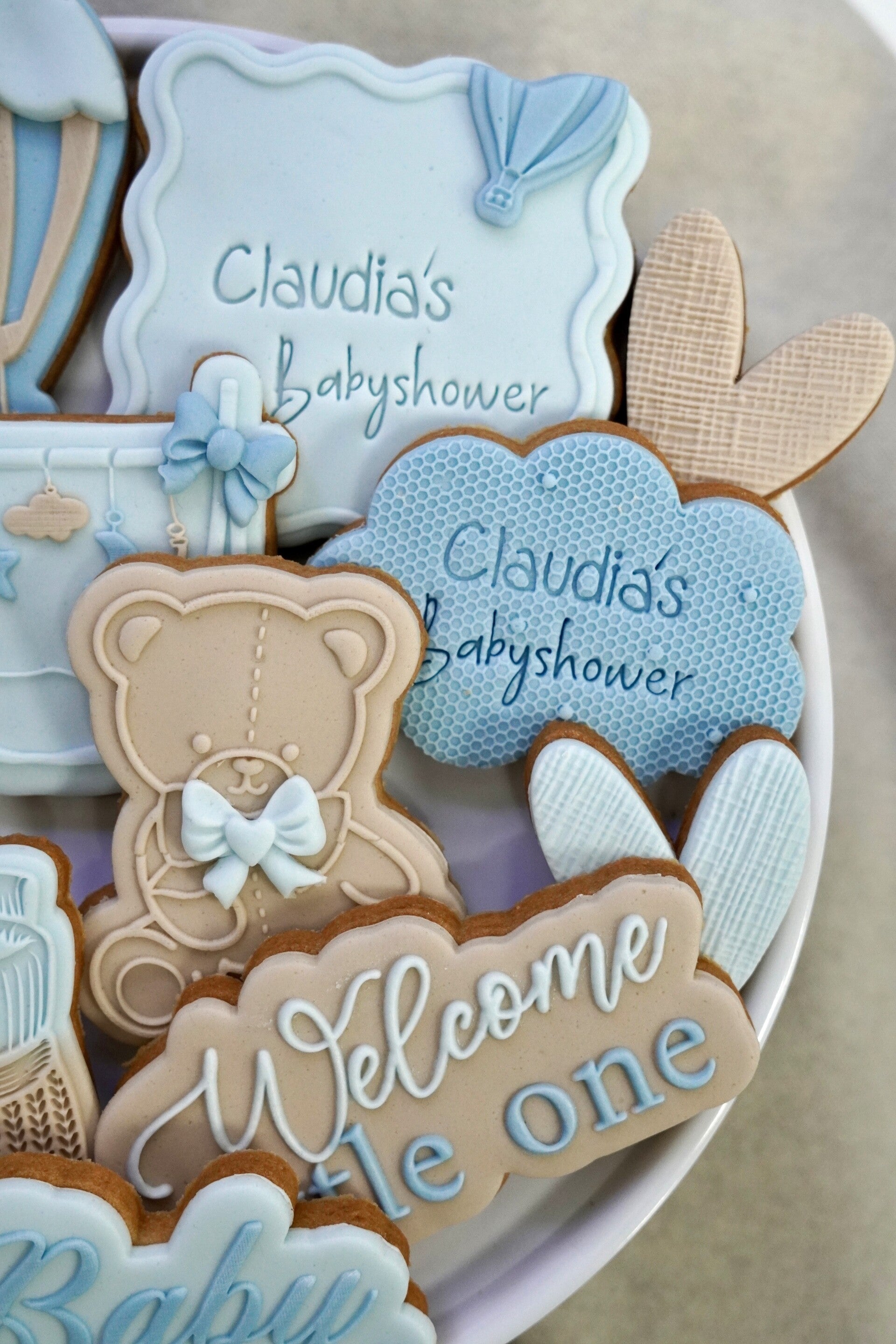 Met deze prachtige Babyshower Baby Boy deluxe set geef je elke babyshower een feestelijke en stijlvolle uitstraling. De set is zorgvuldig samengesteld en bestaat uit diverse deluxe koekjes, uitgevoerd in de kleuren blauw, lichtblauw en beige. Perfect om de komst van een jongetje te vieren.