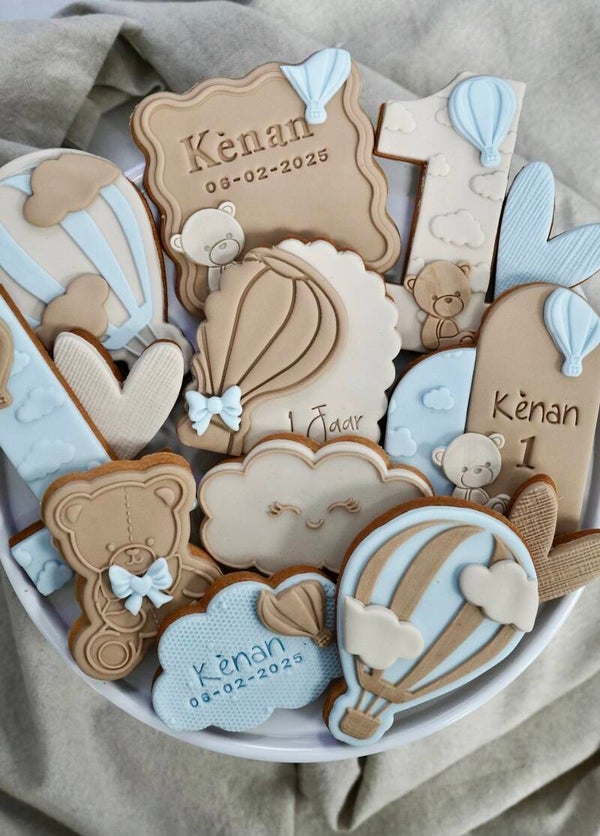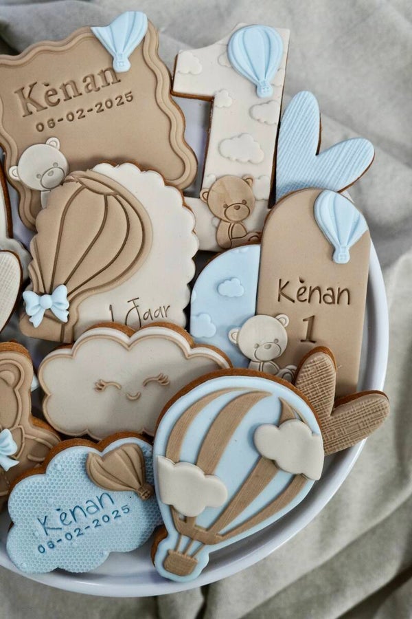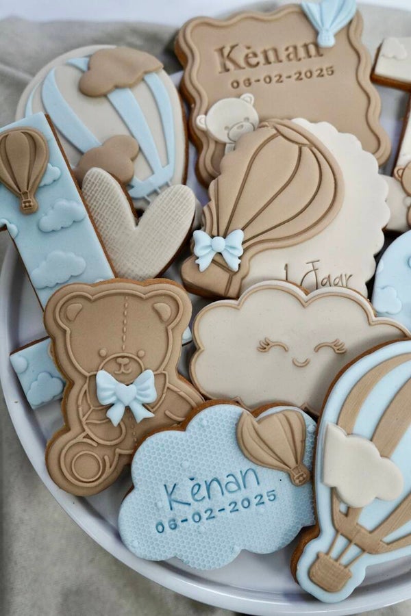 Met schattige details van luchtballonnen en beertjes straalt deze set pure zachtheid en elegantie uit. Elk koekje wordt met zorg en oog voor detail gemaakt, waardoor je een echte Deluxe uitstraling creëert op de feesttafel.