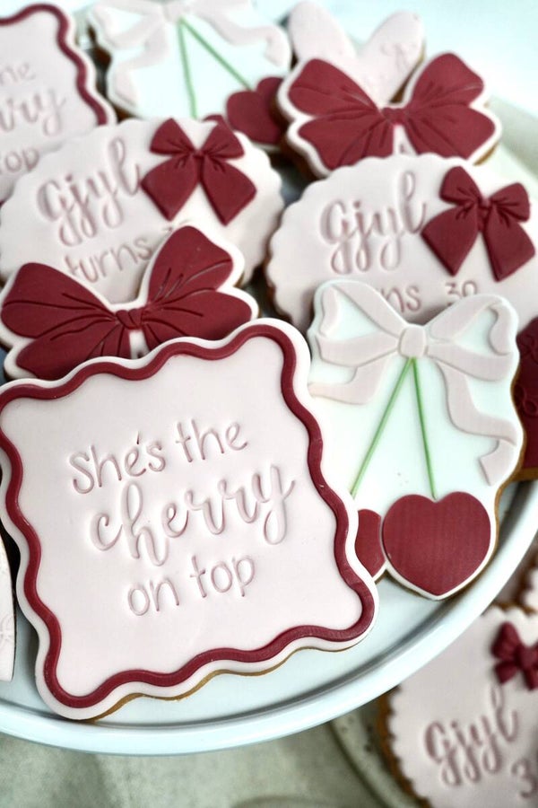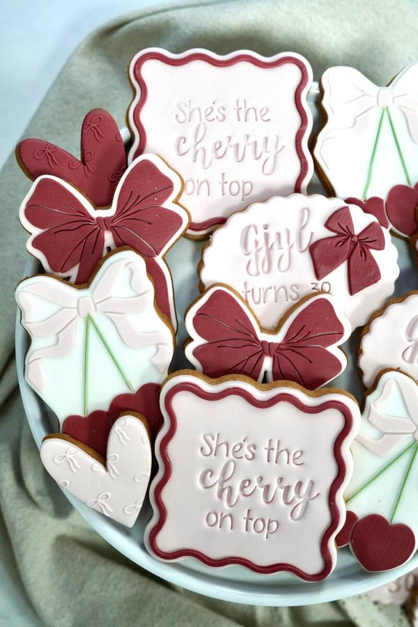 De verfijnde details en het speelse “cherry on top” thema zorgen voor een mooie balans tussen luxe en eenvoud. De Deluxe koekjes geven een rijke en opvallende uitstraling, terwijl de Classic koekjes zorgen voor een subtiel en stijlvol geheel – allemaal perfect op elkaar afgestemd in dezelfde kleuren en sfeer.