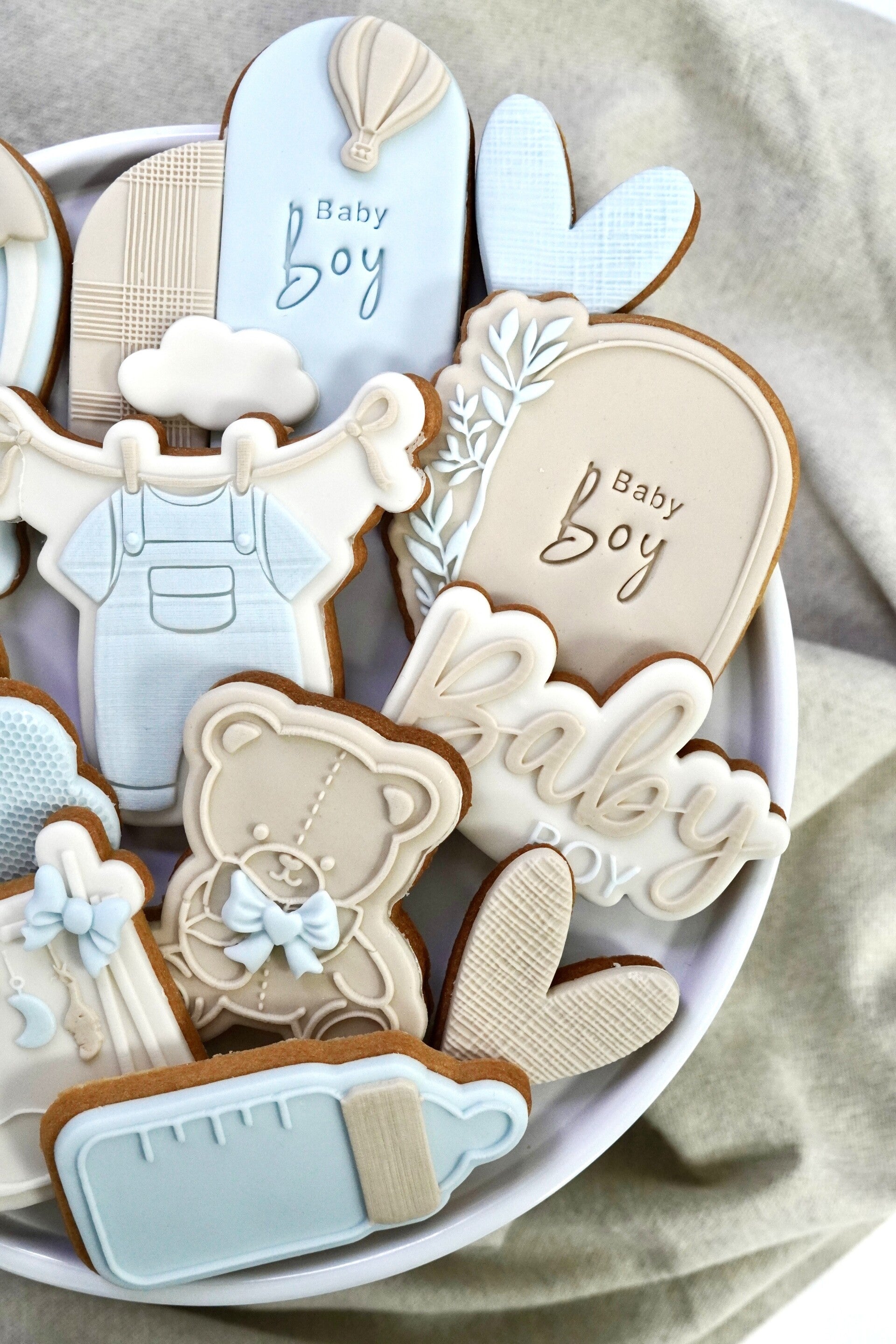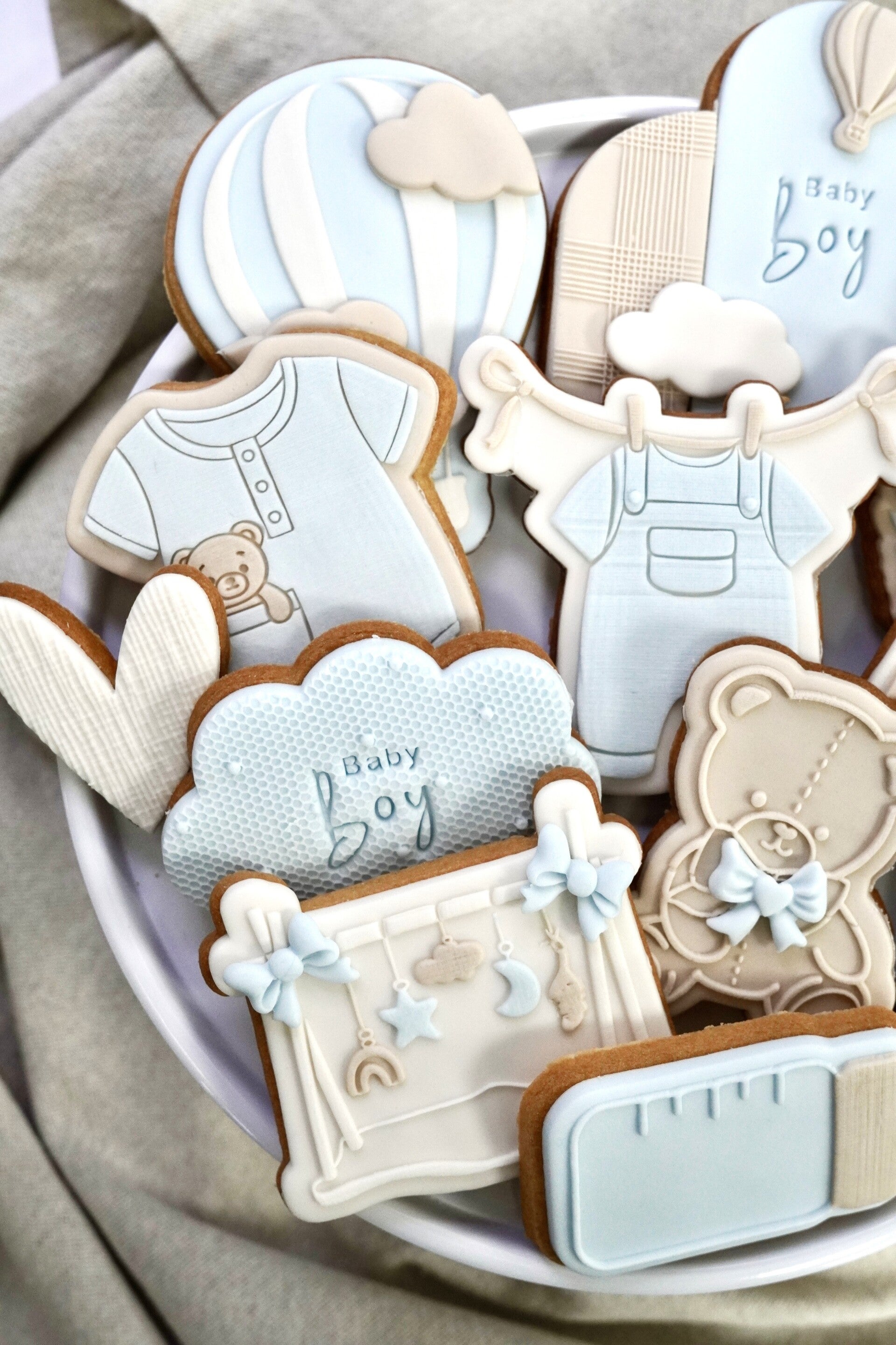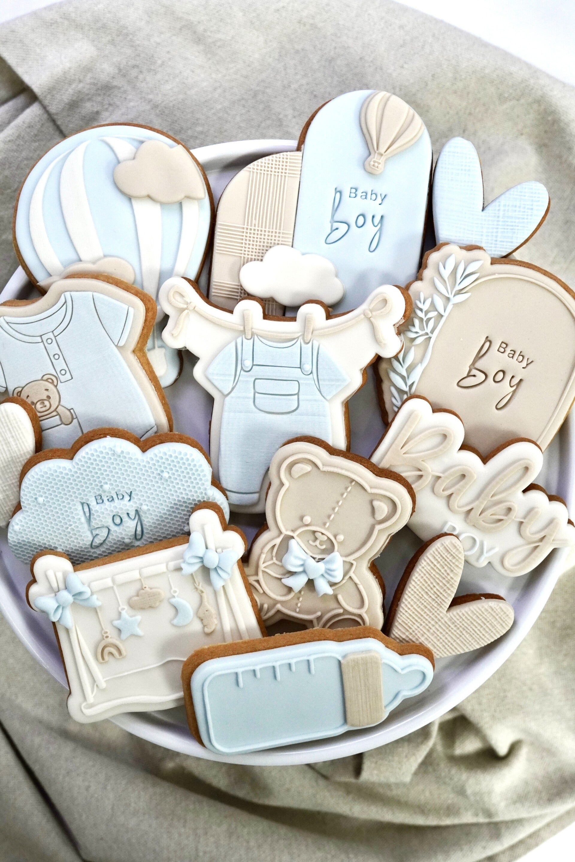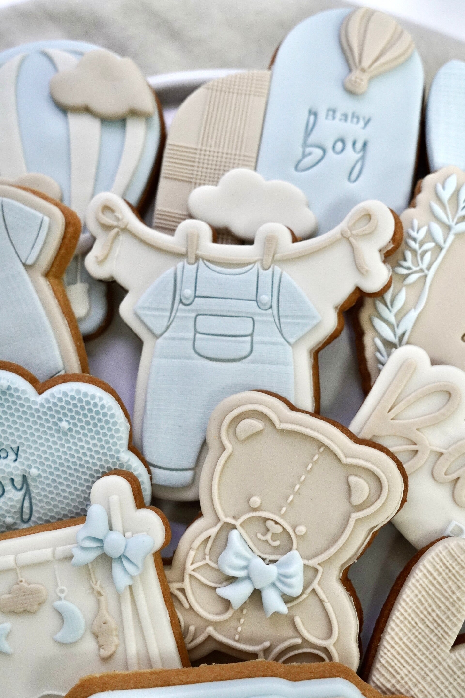 Deze elegante set is uitgevoerd in zachte kleuren van licht beige, beige en licht blauw en perfect voor een geboorte of babyshower. Met 10 verschillende gedecoreerde koekjes straalt deze set pure liefde en luxe uit, helemaal afgestemd op dit bijzondere moment.
